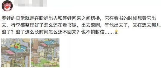 不僅如此,很多“蛙爸蛙媽”都感受到了“兒行千里母擔(dān)憂”的牽掛。一位網(wǎng)友道出了心聲:“養(yǎng)蛙的日常就是在盼蛙出去和等蛙回來之間切換”。