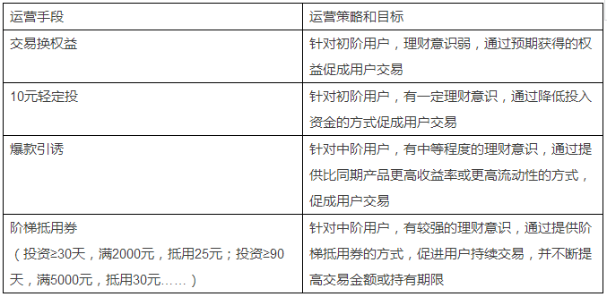 引導用戶完成這幾次交易的主要方式,就是“產品分類引流+運營手段促成”,基于平臺現有的產品類別,以各種運營手段配合,促成用戶完成多次復投,在多種產品之間流轉,最終配置多種類型的產品。