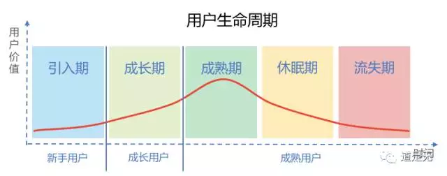用戶生命周期通常分為五個階段,分別為:引入期、成長期、成熟期、休眠期、流失期。