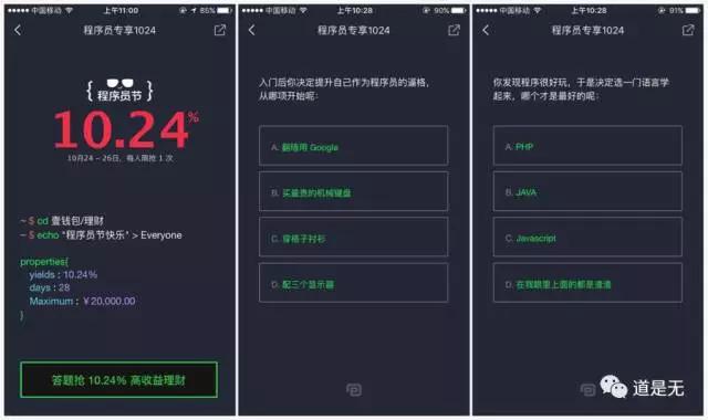 預算不足創意補。抓節日、跟熱點都屬于常規打法了。以平安壹錢包的1024程序員理財節為例。這個活動的玩法是:用戶通過登錄頁面完成針對程序員的一系列題目,就能夠獲取購買年化收益率高達10.24%的專屬理財產品。