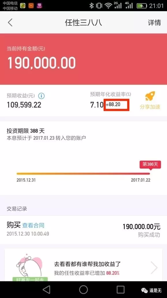 - 用戶購買某一期的任性產品后,可通過微信好友/微信朋友圈/微博/QQ空間等方式分享給好友,參加收益加速
