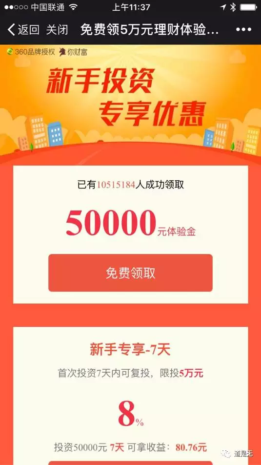 在運營KPI的主導下,基本各大平臺都有自己的一整套新用戶轉化手段。在此以360你財富為例來說明。你財富針對新手用戶(未投資用戶)提供如下組合禮包:
