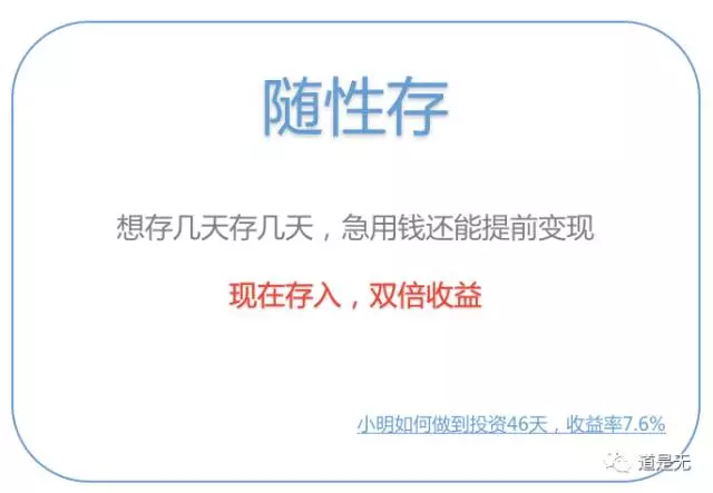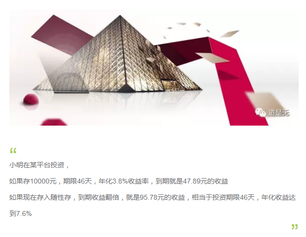 - Step4、妮妮在完成支付后,習慣到“我的理財”界面中看看新完成的交易情況。在產品列表中,又在廣告區看到了“隨性存”的展示,這次她注意到了“小明如何做到投資46天,收益率7.6%”這句話,感到很有意思,于是點擊了鏈接,看到如下圖文結合內容: