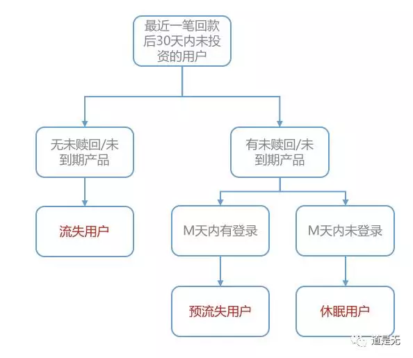 - 在最近一筆回款后的(30+M)天后,用戶無登錄(或其他關鍵操作、正向交易操作)發生,則認為該用戶為休眠用戶