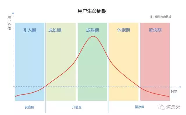 在用戶參與度的持續提升、每個節點的持續轉化過程中,用戶同時完成了在平臺內價值的提升和生命周期的一個完整歷程(引入期、成長期、成熟期、休眠期、流失期)。