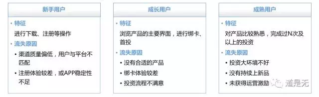 - 成長用戶:這時用戶對產品有了基本的認知,正在進行投資準備工作(綁卡)或已經完成首投。這時發生流失,原因一般是:
