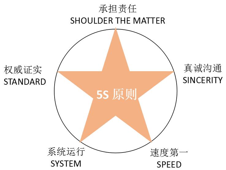 危機公關5S原則:是指危機發生后為解決危機所采用的5大原則,包括承擔責任原則(shouldering the matter)、真誠溝通原則(sincerity)、速度第一原則(speed)、系統運行原則(system)、權威證實原則(standard)。