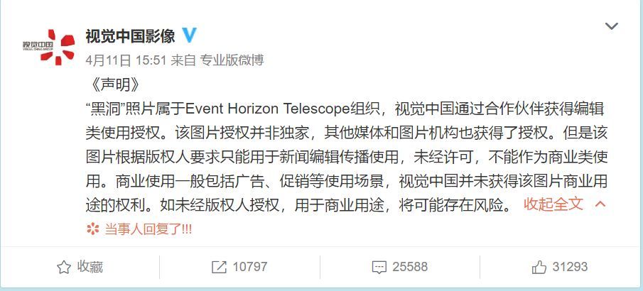 首先是視覺中國,在事發后兩天內連發3份聲明:第一份聲明主旨為“黑洞”照片有部分版權,無商業用途版權;