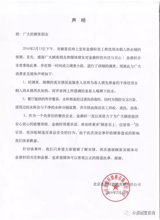 盡管事后再三解釋、承諾,也只能讓人感覺越描越黑,難以挽回金鼎軒品牌形象的損害。