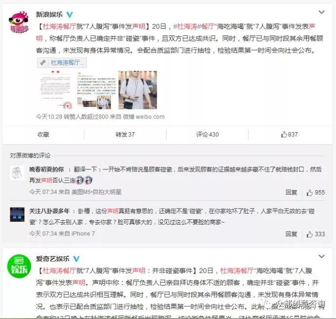 但后續因餐廳負責人的回復不當以及后續的兩次推脫,導致食客將事件曝光至微博@杜海濤直接引起輿論的嘩然,公眾質疑和聲討,后續輿論自由發酵導致杜海濤餐廳及杜海濤本人聲譽嚴重受損。