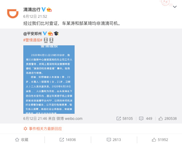 6月12日 21:52,鄭州公安雷霆辦案,真相大白。@平安鄭州公布事實:視頻表演者是夫妻關系,兩人所作所為只是為了在非法直播App通過色情表演牟利。在@平安鄭州發布通報6分鐘后,滴滴官微轉發,時間緊急,只說了最關鍵的信息:“經過我們比對查證,車某濤和郜某琦均非滴滴司機。”滴滴與滴滴司機再一次被誤傷,實錘。