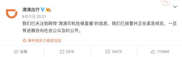 6月15日,滴滴就網傳“司機性侵直播”一事回應稱,將正式起訴視頻表演者以及涉黃直播平臺星戀直播。6月10日開始在網絡發酵的“司機性侵直播”一事塵埃落定。警方調查結果顯示網傳視頻中車某濤與郜某琦為夫妻關系,二人公開進行色情表演已被警方抓獲,案件正在進一步辦理中。