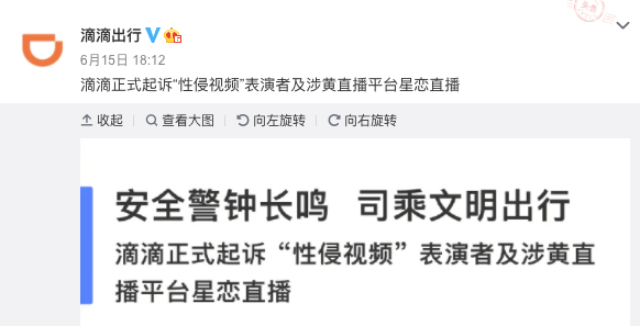 在公眾認為到此這一事件已被劃上句號時,6月15日 18:12:滴滴宣布正式起訴“性侵視頻”表演者及涉黃直播平臺星戀直播,對于當時未經核實發布#滴滴司機直播性侵案#話題的網友,則不予起訴。對于滴滴來說只是真相大白是不夠的,拿起法律武器捍衛平臺特別是網約車司機群體的利益,滴滴作為平臺責無旁貸。