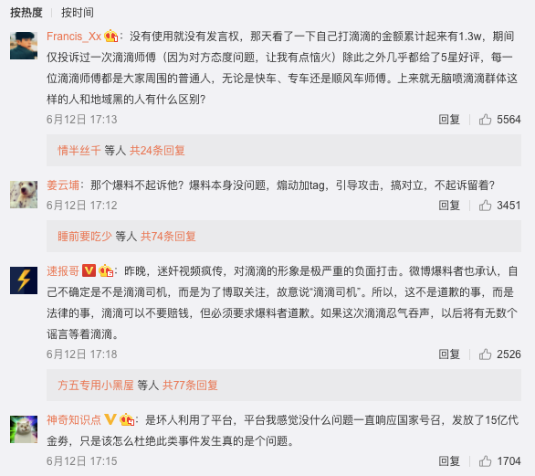 網友Francis_Xx在本條微博下的評論獲得最高贊:“沒有使用就沒有發言權,那天看了一下自己打滴滴的金額累計起來有1.3w,期間僅投訴過一次滴滴師傅(因為對方態度問題,讓我有點惱火)除此之外幾乎都給了5星好評,每一位滴滴師傅都是大家周圍的普通人,無論是快車、專車還是順風車師傅。上來就無腦噴滴滴群體這樣的人和地域黑的人有什么區別?”
