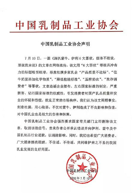 7月10日,中國乳制品工業協會(簡稱:中國乳品協會)通過其官方微信公號發布聲明,聲明針對一篇名為《深扒蒙年、伊利六大罪狀,媒體不敢說,那就我來說》的文章指出:該文用“6大罪狀”等極具沖擊力的標題吸引眼球,惡意杜撰多家乳企“產品質量不達標”“往牛奶里添加化學物質”“降低檢驗標準”“壓榨奶農”“欺詐消費者”等罪狀,文章造謠企業擺布、左右國家標準的制定,嚴重損害、玷污國家標準的權威性,引發消費者對國產乳品質量和安全的懷疑和恐慌,擾亂正常的市場秩序。
