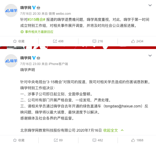 以嗨學(xué)網(wǎng)為例,央視315晚會說收到上百封投訴信。它的危機公關(guān)策略就是:1、不管報道我啥負(fù)面,我都先回一條,這條可以適用于任何負(fù)面;2、針對具體曝光內(nèi)容,給出一個階段性決策和行動。