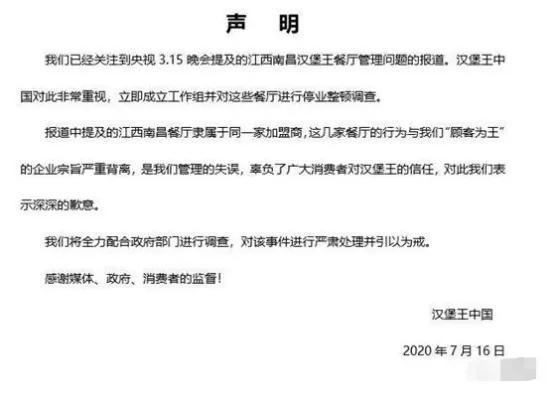 在被曝光約1個小時后,漢堡王中國進行了回應,稱已立即成立工作組并對相關餐廳進行停業整頓調查,報道中提及的江西南昌餐廳,與“顧客為王”的企業宗旨嚴重背離,辜負了廣大消費者對漢堡王的信任,對此漢堡王表示深深的歉意,將全力配合政府部門進行調查,并對該事件進行嚴肅處理并引以為戒。