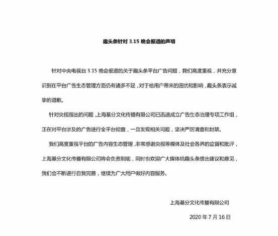趣頭條先是用一份排版都不齊的聲明進行回應,速度是夠快,但不夠穩重,甚至連公章都沒有來不及蓋,趣頭條的慌張可見一斑。