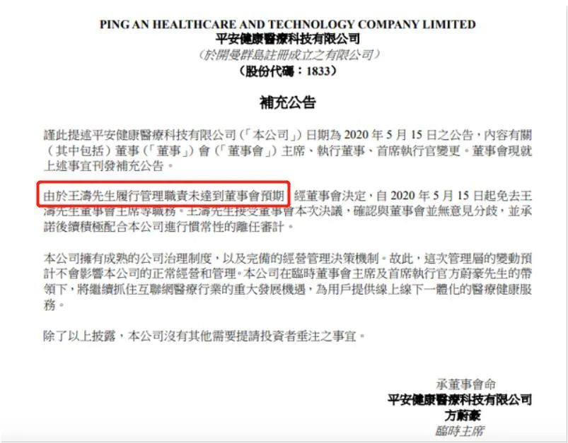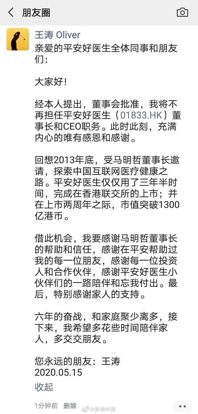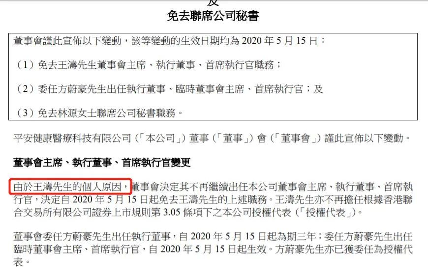 事實上早在四天前,也就是5月15日,平安好醫(yī)生就曾發(fā)布公告,聲稱王濤是由于個人原因離職的。