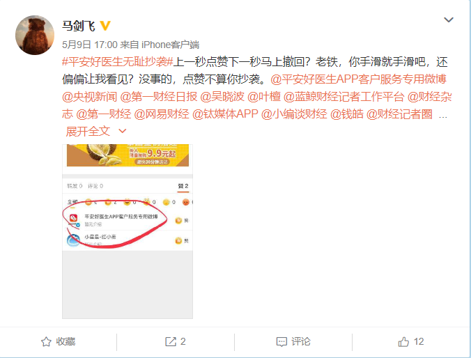 5月9日,雪揚科技CEO馬劍飛在個人認證微博上發(fā)布長文,控訴平安好醫(yī)生不正當競爭,侵犯商業(yè)秘密。