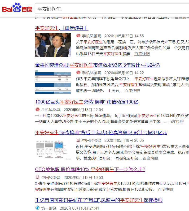 同時遭遇侵權(quán)+換帥風(fēng)波,平安好醫(yī)生可謂是流年不利。本菜雞公關(guān)搜了下這段時間百度新聞頁面的部分媒體報道,從標題上也可以看出,平安好醫(yī)生面臨的輿論處境是相當艱難。