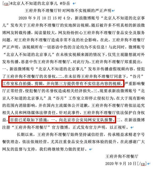 從時間上看,“谷岳”上傳視頻是在9月8日,“北京人所不知道的北京事兒"轉發是在9月10日下午15點左右,當天下午,“王府井狗不理店"就迅速發表聲明,指責“北京人所不知道的北京事兒"評價均為不實信息,是“惡語中傷”,認為他已經侵犯到了狗不理的名譽權,而視頻拍攝人谷岳私自拍攝、剪輯不實信息并向他人傳播,已經侵犯到餐廳聲譽權并造成經濟損失。
