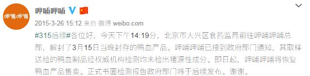 在呷哺呷哺鴨血事件,官方檢測為呷哺呷哺帶來了好消息。3月26日,呷哺呷哺官方微博發布消息:“今天下午14:19分,北京市大興區食藥監局前往呷哺呷哺總部,解封了3月15日當晚封存的鴨血產品。呷哺呷哺已接到政府部門通知,其取樣送檢的鴨血制品經權威機構檢測均未檢出豬源性成分。即日起,呷哺呷哺將恢復鴨血產品售賣。正式書面檢測報告政府部門將于后續發布。”