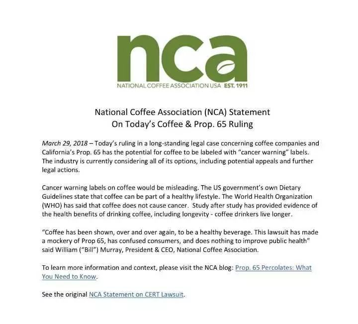 全美咖啡行業協會關于加州第65號判決的公告 (2018年3月29日)