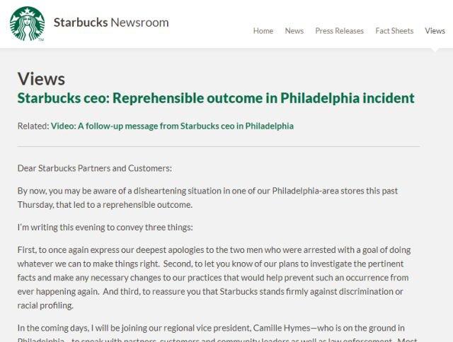最高領導人親臨現場,并頻頻道歉。首席執行官凱文·約翰遜在4月16日第一時間飛抵費城向兩名黑人道歉,并和費城的市長見面。