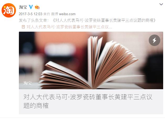 事件發生在兩會時期,3.15前夕這種敏感時期,淘寶在處理上面稍有不慎則會嚴重影響企業的品牌形象。3月5日中午,淘寶在其官方微博、微信發文《對人大代表馬可·波羅瓷磚董事長黃建平三點議題的商榷》作為回應。據統計,這邊文章獲得200萬+的閱讀量。以下是文章全部內容: