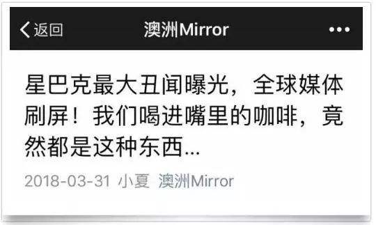 2018年3月29日,一個名為“澳洲Mirror”的公眾號撰寫了一篇文章:《星巴克最大丑聞曝光,全球媒體刷屏!我們喝進嘴里的咖啡,竟然都是這種東西......》。文章中作者宣傳“喝星巴克咖啡致癌,是被隱瞞了8年的真相......”、“美國洛杉磯法院的一紙裁定,可以說是直接判了星巴克的死刑”等等對星巴克不利的內容。