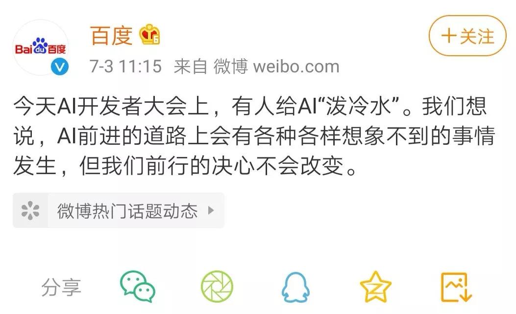 百度微博當事發時立刻在微博上做出回應,“今天AI開發者大會上,有人給AI“潑冷水”。我們想說,AI前進的道路上會有各種各樣想象不到的事情發生,但我們前行的決心不會改變。 ?”