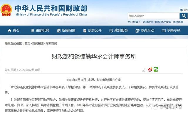 2月10日,財政部公開表示,高度重視德勤華永會計師事務所員工舉報問題,第一時間約談該所主要負責人,要求該所進行認真自查,并稱2021年將對注冊會計師行業突出問題進行集中整治。同日,中國注冊會計師協會表態,約談德勤華永會計師事務所,將配合有關監管部門做好調查工作,從嚴加強行業自律監管,主動排查風險,對違反執業準則規則和職業道德規范的會計師事務所和注冊會計師,以“零容忍”的態度,堅決依規懲戒,切實維護金融市場健康穩定發展。