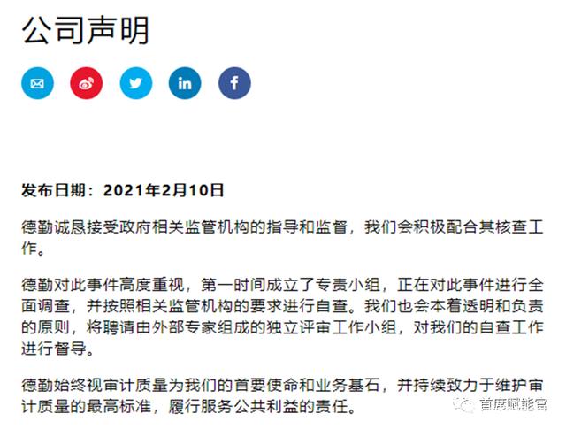 當天夜間,德勤回應稱,會積極配合核查工作。第一時間成立了專責小組,正在對此事件進行全面調查,并按照相關監管機構的要求進行自查。