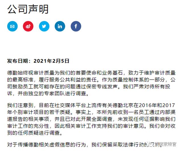 2月5日,德勤發布聲明稱“本所先前收到一名員工通過內部渠道報告的相關事項,并且已對此開展全面調查,未發現任何證據影響我們審計工作的充分性,因此相關審計工作支持我們的審計意見。我們會對收到的任何質疑進行調查。”