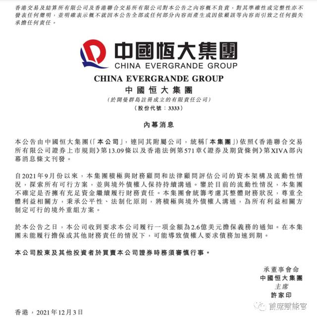 12月3日,中國恒大集團在香港聯交所發布了無法履行擔保責任的公告,廣東省人民政府當晚立即約談了中國恒大集團實控人許家印。廣東省人民政府網站當日消息顯示,應恒大地產集團有限公司請求,為有效化解風險,保護各方利益,維護社會穩定,廣東省人民政府同意向恒大地產集團有限公司派出工作組,督促推進企業風險處置工作,督促切實加強內控管理,維護正常經營。