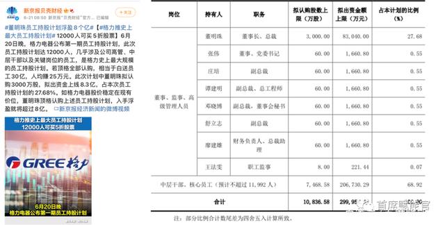 2021年6月20日晚間,格力電器公告第一期員工持股計劃(草案),顯示股票來源為回購專用賬戶中已回購的股份,員工持股購買價格為27.68元/股(約為公告前一個交易日格力電器股價的50%),對象包括公司董(不含獨立董事)監高,以及公司及控股子公司經董事會認定對公司整體業績和中長期發展具有重要作用的中層干部和核心員工。