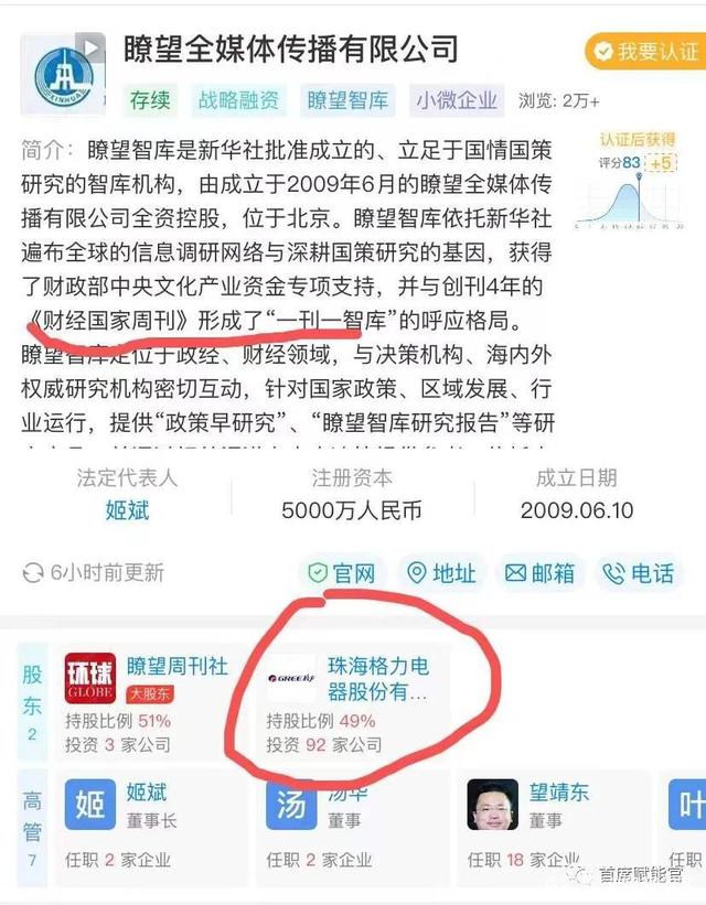 據公開資料,《財經國家周刊》由新華社主管,但其發行、廣告及各類品牌經營活動的代理商是格力電器持股49%的瞭望全媒體傳播有限公司。