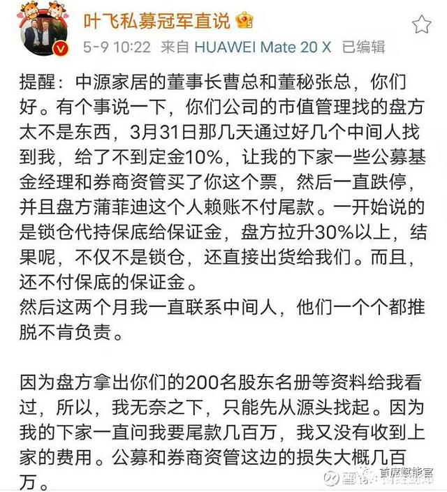 2021年5月9日,微博賬號“葉飛私募冠軍直說”公開向上市公司中源家居董事長及董秘喊話,稱后者市值管理找的操盤方沒有向下家(接盤方)及時支付尾款,且因中源家居股價連續下跌,參與其中的公募基金經理和券商資管損失很大,自己作為中間人已經難以向下家交代。除了中源家居,其還在爆料中提到了維信諾、昊志機電、隆基機械、東方時尚等上市公司,并揚言要曝光不低于18家上市公司的類似內幕。