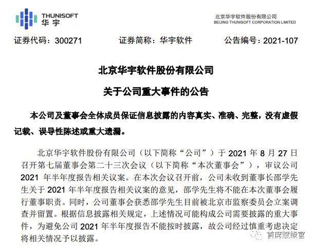 2021年8月29日,華宇軟件發布公告,2021年3月22日,公司收到北京市監察委員會通知,對公司實控人,董事長、總經理邵學涉嫌行賄的違法問題立案調查,并自2021年3月21日對其實施留置。