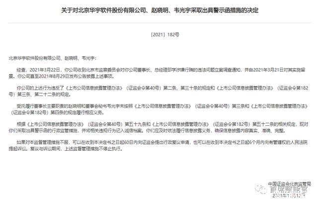 11月16日,北京證監局向華宇軟件以及趙曉明、韋光宇出具警示函,認定,華宇軟件違反了《上市公司信息披露管理辦法》(證監會令第40號)第二條、第三十條的規定和《上市公司信息披露管理辦法》(證監會令第182號)第三條、第二十二條的規定;受托履行董事長主要職責的趙曉明和董事會秘書韋光宇未按照《上市公司信息披露管理辦法》(證監會令第40號)第三條和《上市公司信息披露管理辦法》(證監會令第182號)第四條的規定履行相應義務。