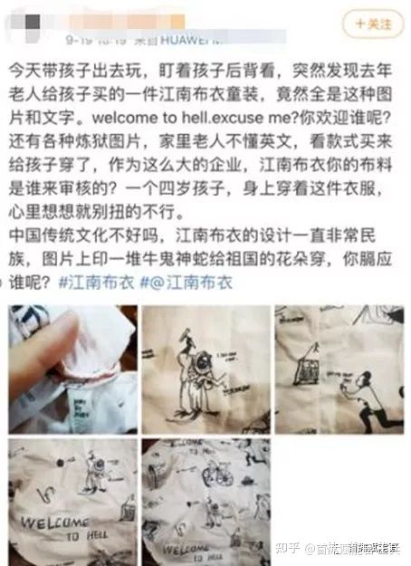 【事件梗概】2021年9月19日,一位網(wǎng)友在社交網(wǎng)站上發(fā)文稱家里的一件“江南布衣”品牌童裝上印滿了“Welcome to hell(歡迎來(lái)到地獄)”、“l(fā)et me touch you(讓我摸摸你)”、“I just need a foot(我只要一只腳)”等字樣,以及一些如砍斷腿、煉獄的圖案,引起了部分網(wǎng)友的關(guān)注和討論。一些網(wǎng)友翻出自己之前購(gòu)買(mǎi)的該品牌童裝,發(fā)現(xiàn)上面也有此類圖案與英文。討論中,有網(wǎng)友指出該品牌此前部分廣告海報(bào)風(fēng)格陰森恐怖、含有暴力色情等元素。