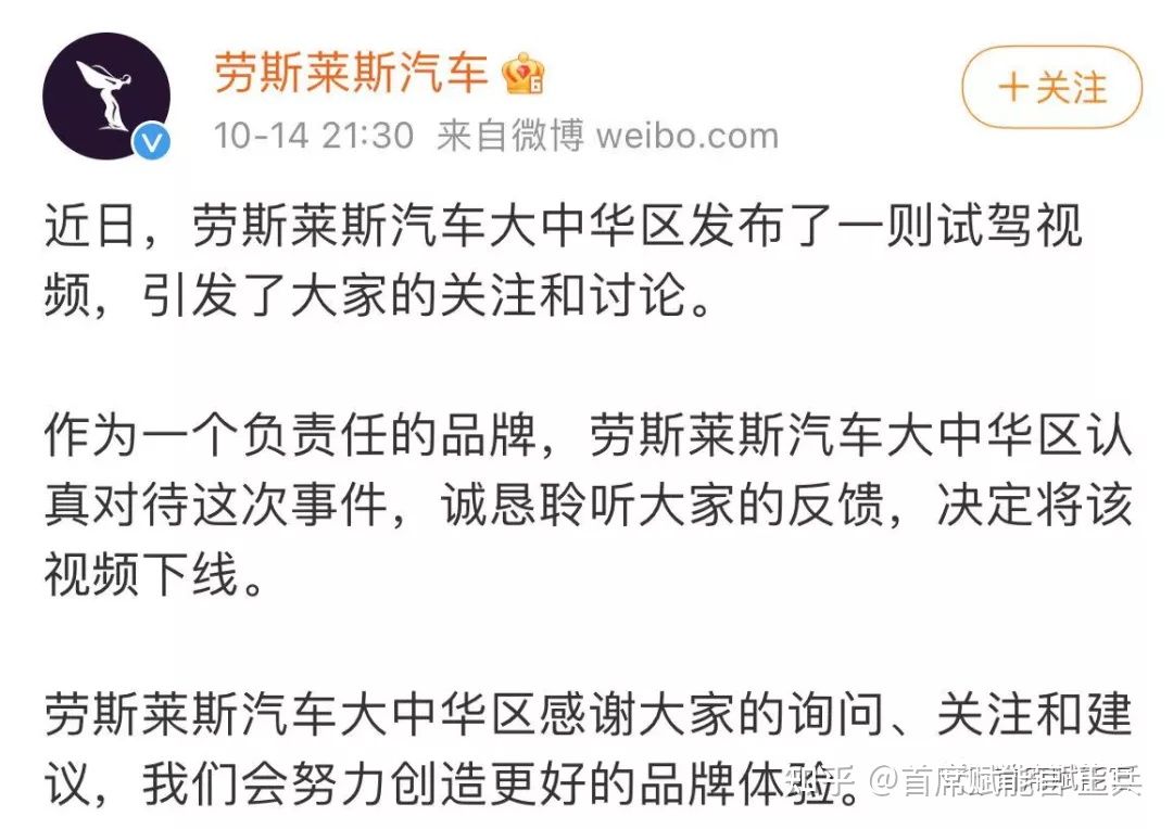 【同類案例】2021年9月24日,勞斯萊斯官方賬號(hào)發(fā)了一段營(yíng)銷(xiāo)視頻,視頻主角是網(wǎng)紅晚晚林涵夫妻。發(fā)布該視頻所配的文案是:“勞斯萊斯庫(kù)里南西域?qū)ふ椋v行天山之南,展現(xiàn)出這款奢華汽車(chē)的冒險(xiǎn)精神,盡享“無(wú)處不從容”的人生巔峰。”內(nèi)容發(fā)出后,遭到部分網(wǎng)友的反感,認(rèn)為這是拉低用戶的檔次,更有網(wǎng)友不斷起底這視頻主角晚晚林涵夫妻的“黑料”。10月11日,王思聰作為車(chē)主,在評(píng)論區(qū)稱“以后不會(huì)買(mǎi)了”,輿論進(jìn)一步發(fā)酵。10月14日勞斯萊斯下架視頻并發(fā)布聲明,表示會(huì)認(rèn)真對(duì)待此次事件,誠(chéng)懇聆聽(tīng)大家的反饋,“決定將該視頻下架。”