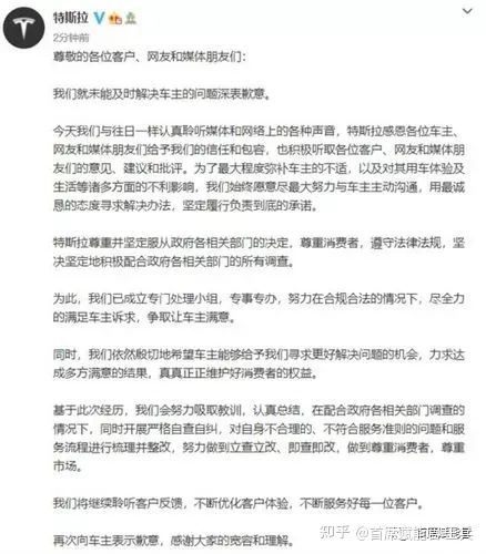 特斯拉副總裁陶琳回應(yīng)稱,“近期的負(fù)面都是她貢獻(xiàn)的”、“我們沒(méi)有辦法妥協(xié)……”、“我們自己的調(diào)研顯示,90%的客戶都愿意再次選擇特斯拉”。此言論進(jìn)一步刺激了輿論,大量媒體發(fā)表批評(píng)特斯拉的報(bào)道。19日下午,新華社發(fā)表評(píng)論文章《“車(chē)頂維權(quán)”成熱點(diǎn),是誰(shuí)讓誰(shuí)不“體面”?》指出“消費(fèi)者對(duì)于產(chǎn)品質(zhì)量和服務(wù)的關(guān)切,車(chē)企應(yīng)當(dāng)更加認(rèn)真,直面問(wèn)題。”當(dāng)天深夜,特斯拉發(fā)布官方聲明,表示愿意全力配合國(guó)家級(jí)的第三方權(quán)威機(jī)構(gòu)的全方位檢測(cè)。如果是特斯拉產(chǎn)品的問(wèn)題,特斯拉一定堅(jiān)決負(fù)責(zé)到底,該賠的賠,該罰的罰,但如果是不合理的訴求也不會(huì)妥協(xié)。