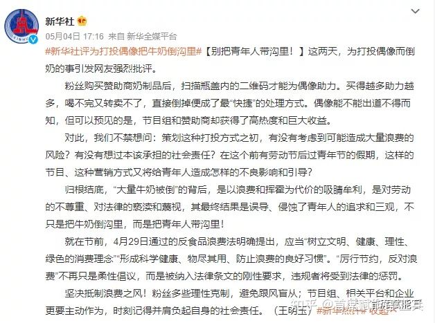 5月4日 新華社發(fā)表評(píng)論【別把青年人帶溝里!】指出,“大量牛奶被倒”的背后,是以浪費(fèi)和揮霍為代價(jià)的吸睛牟利,是對(duì)勞動(dòng)的不尊重、對(duì)法律的褻瀆和蔑視,是誤導(dǎo)、侵蝕了青年人的追求和三觀,不只是把牛奶倒溝里,而是把青年人帶溝里!當(dāng)天,北京市廣電局,責(zé)令平臺(tái)方暫停對(duì)《青春有你》第三季的錄制,要求該平臺(tái)嚴(yán)格落實(shí)廣電行政部門(mén)有關(guān)規(guī)定,完善節(jié)目管理制度,認(rèn)真核查并整改存在的問(wèn)題。次日凌晨,《青春有你》制作組在官方賬號(hào)上做出回應(yīng),表示對(duì)懲罰堅(jiān)決服從,誠(chéng)懇接受,認(rèn)真核查并整改問(wèn)題,力求更加嚴(yán)格細(xì)致地把握節(jié)目制作的每個(gè)環(huán)節(jié),積極營(yíng)造健康的網(wǎng)絡(luò)環(huán)境,感謝社會(huì)各界的關(guān)心和督導(dǎo),對(duì)出現(xiàn)的問(wèn)題深表歉意。
