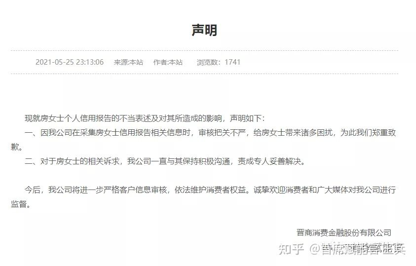 據(jù)媒體報(bào)道,2018年4月,房女士在位于南通中南大廈的晉商消費(fèi)金融股份有限公司分支機(jī)構(gòu)簽署了一份162000元的個(gè)人消費(fèi)貸款合同,貸款期限約定36個(gè)月,當(dāng)月下款時(shí)就被不明不白扣掉了11340元。房女士從2018年5月持續(xù)按約還款,直到2020年1月,21個(gè)月內(nèi)累計(jì)還款124902.12元。新冠疫情發(fā)生后,晉商消費(fèi)金融公司針對(duì)受疫情影響暫無(wú)法按期還款的客戶推出一些優(yōu)惠服務(wù),房女士也申請(qǐng)了貸款展期。征信報(bào)告顯示,這項(xiàng)貸款在2020年2-12月沒(méi)有還款的計(jì)劃安排。進(jìn)入2021年,房女士沒(méi)有恢復(fù)還款,因?yàn)椤皩?duì)當(dāng)初下款被扣的1萬(wàn)多元持有異議,又一直沒(méi)有得到合理的解釋”。事件發(fā)生后,人民銀行太原中心支行于4月8日、5月25日,先后兩次約談晉商消費(fèi)金融公司,出具監(jiān)管意見(jiàn)、嚴(yán)肅提出后續(xù)整改要求。5月25日深夜,晉商消金官網(wǎng)發(fā)布聲明,就房女士個(gè)人信用報(bào)告中的不當(dāng)表述及對(duì)其所造成的影響致歉;同時(shí),晉商消金表示歡迎消費(fèi)者和廣大媒體對(duì)該公司進(jìn)行監(jiān)督。