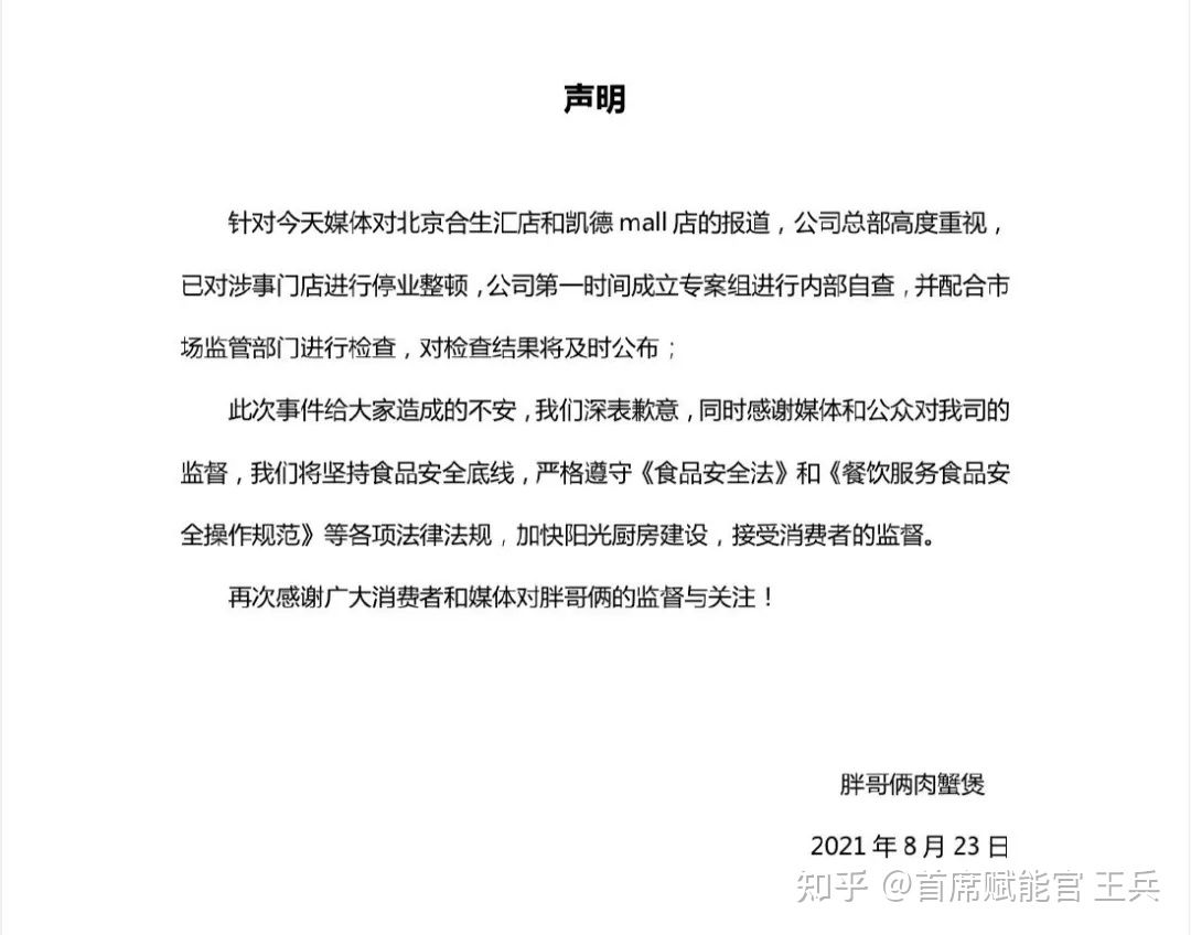 【同類案例】2021年8月23日,同為網(wǎng)紅餐飲品牌的胖哥倆被爆出食品安全問(wèn)題。據(jù)媒體暗訪調(diào)查發(fā)現(xiàn),胖哥倆標(biāo)榜現(xiàn)宰現(xiàn)殺的螃蟹,卻是前一天沒(méi)賣(mài)完的螃蟹冷藏后第二天繼續(xù)賣(mài),清洗后的隔夜螃蟹便可以充當(dāng)新鮮螃蟹重新送上顧客的餐桌;包裝袋上標(biāo)識(shí)即將過(guò)期的土豆,店員在拆封包裝后繼續(xù)被當(dāng)作可以使用的食材。當(dāng)天,胖哥倆官微發(fā)聲明對(duì)此進(jìn)行回應(yīng),稱已對(duì)涉事門(mén)店進(jìn)行停業(yè)整頓,公司第一時(shí)間成立專案組進(jìn)行內(nèi)部自查,并配合市場(chǎng)監(jiān)管部門(mén)進(jìn)行檢查,對(duì)檢查結(jié)果將及時(shí)公布。