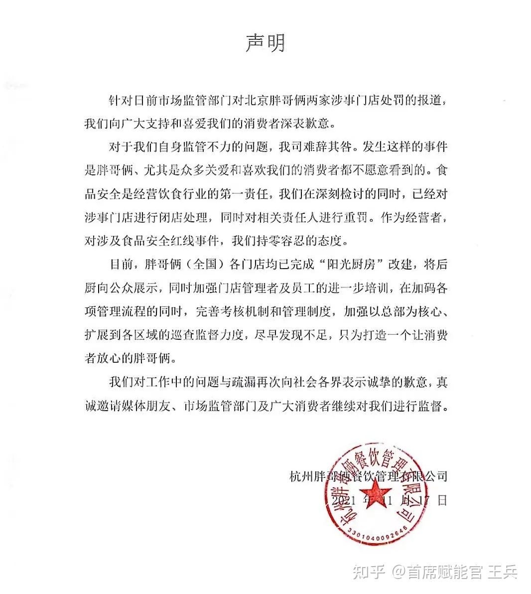 同日,北京市豐臺(tái)區(qū)市場(chǎng)監(jiān)督管理局對(duì)涉事門(mén)店的相關(guān)食材進(jìn)行現(xiàn)場(chǎng)抽檢,并表示擬對(duì)其進(jìn)行約談,后續(xù)將依法進(jìn)行立案調(diào)查。北京市朝陽(yáng)區(qū)市場(chǎng)監(jiān)管局執(zhí)法人員也對(duì)涉事門(mén)店進(jìn)行了檢查,要求涉事門(mén)店停業(yè)整頓,并下線第三方訂餐平臺(tái)的外賣(mài)服務(wù),對(duì)涉事門(mén)店負(fù)責(zé)人進(jìn)行了約談。第二天,胖哥倆創(chuàng)始人、副總裁陳炳斐接受媒體采訪時(shí)表示,公司總裁張靈翰已前往北京配合調(diào)查,依據(jù)調(diào)查結(jié)果,涉事兩家門(mén)店或被永久關(guān)閉。然而,就在這位總裁面對(duì)媒體痛哭流涕道歉之后,胖哥倆品控部負(fù)責(zé)人方兵兵卻回應(yīng)時(shí)辯稱,“實(shí)際是活蟹宰殺,當(dāng)天沒(méi)用完,放到了第二天,符合公司規(guī)范。”11月17日,#北京胖哥倆使用隔夜死蟹被罰50萬(wàn)#登上熱搜。根據(jù)北京市市場(chǎng)監(jiān)督局官網(wǎng)顯示,北京市豐臺(tái)區(qū)市場(chǎng)監(jiān)督管理局對(duì)胖哥倆主體公司北京宏聚餐飲有限公司進(jìn)行警告、罰款50萬(wàn)元并沒(méi)收違法所得6974元。針對(duì)處罰,胖哥倆發(fā)布聲明稱,“胖哥倆各門(mén)店均已完成‘陽(yáng)光廚房’改建,將后廚向公眾展示,同時(shí)加強(qiáng)門(mén)店管理者及員工的進(jìn)一步培訓(xùn)。”