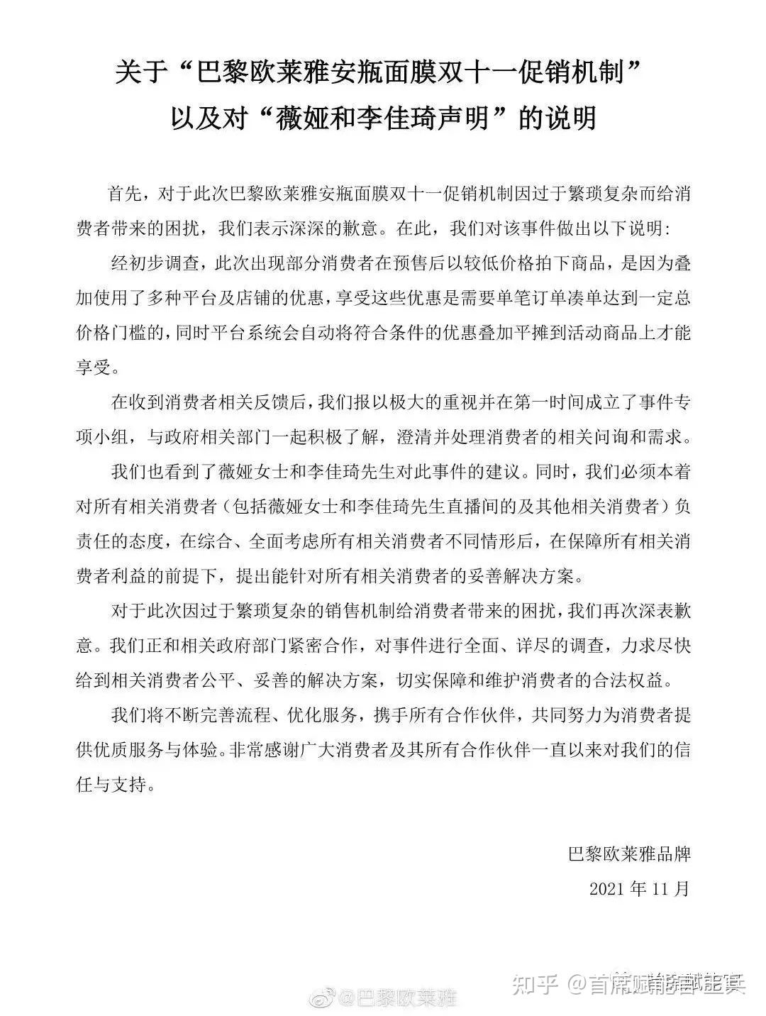 11月18日凌晨2:15,巴黎歐萊雅發(fā)布“關(guān)于‘巴黎歐萊雅安瓶面膜雙十一促銷(xiāo)機(jī)制’以及對(duì)‘薇婭和李佳琦聲明’的說(shuō)明”。表示消費(fèi)者之所以在直播間拿到最低價(jià),是因?yàn)榀B加了平臺(tái)和店鋪999減200的優(yōu)惠券,想要享受這些優(yōu)惠,需要達(dá)到一定的消費(fèi)門(mén)檻。在收到消費(fèi)者相關(guān)反饋后,已成立事件小組,目前正和相關(guān)政府部門(mén)緊密合作,力求盡快給到相關(guān)消費(fèi)者公平、妥善的解決方案。