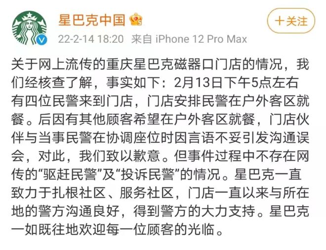2月14日,星巴克中國發(fā)布了一份稍顯草率和不正式的致歉聲明,表示:“其他顧客希望在戶外客區(qū)就餐,因協(xié)調(diào)座位時言語不妥引發(fā)溝通誤會”,致以歉意,澄清不存在“驅(qū)趕民警”和“投訴民警”的情況。
